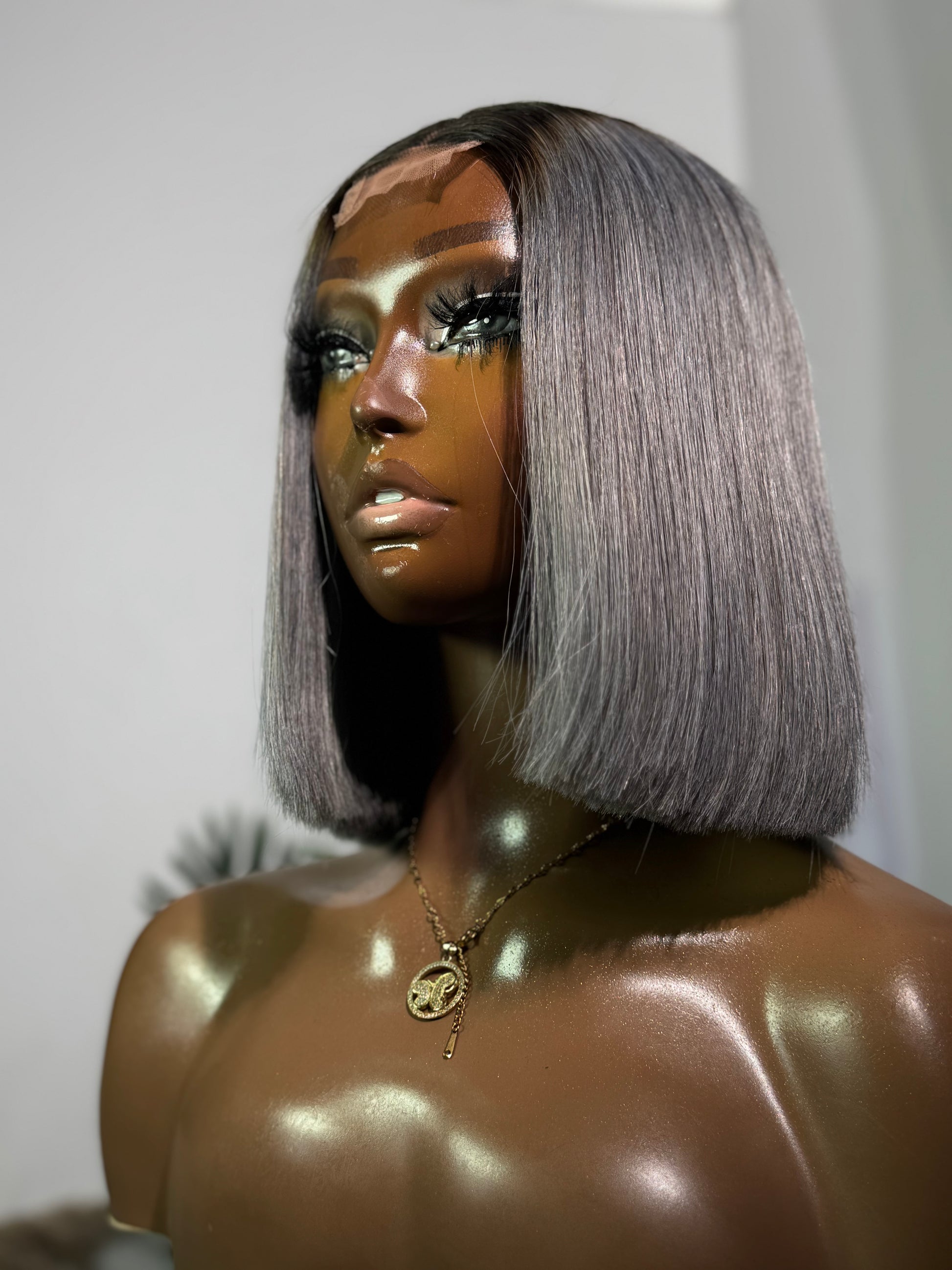 DD 10” Kim k Grey Bob wig with dark root.